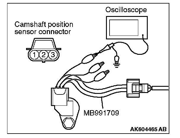 1. Disconnect the camshaft position sensor connector, and connect the test harness special tool (MB991709) between the separated connector (All terminals should be connected).