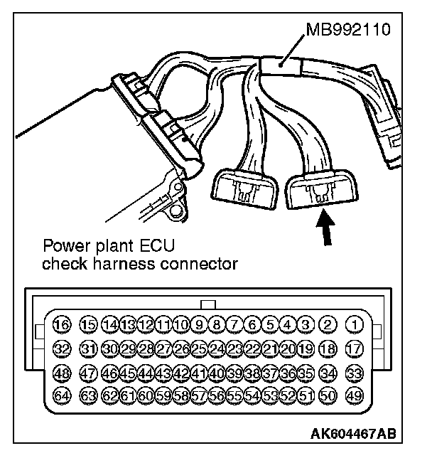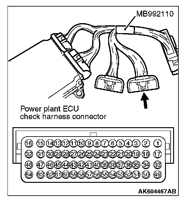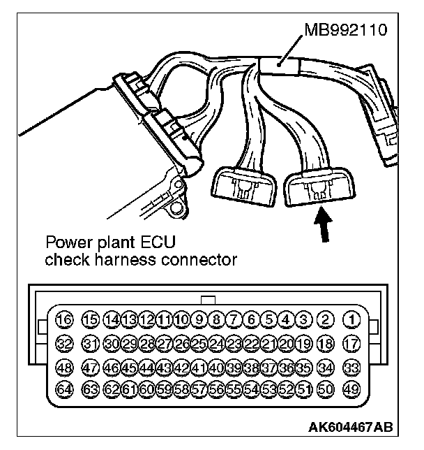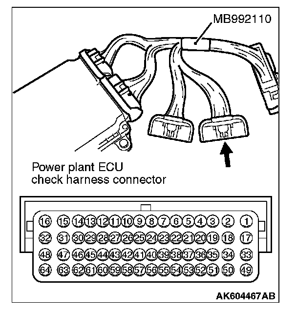 1. Disconnect all ECM connectors. Connect the check harness special tool (MB992110 between the separated connectors.