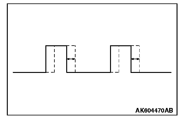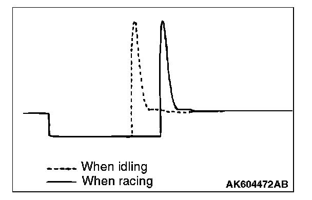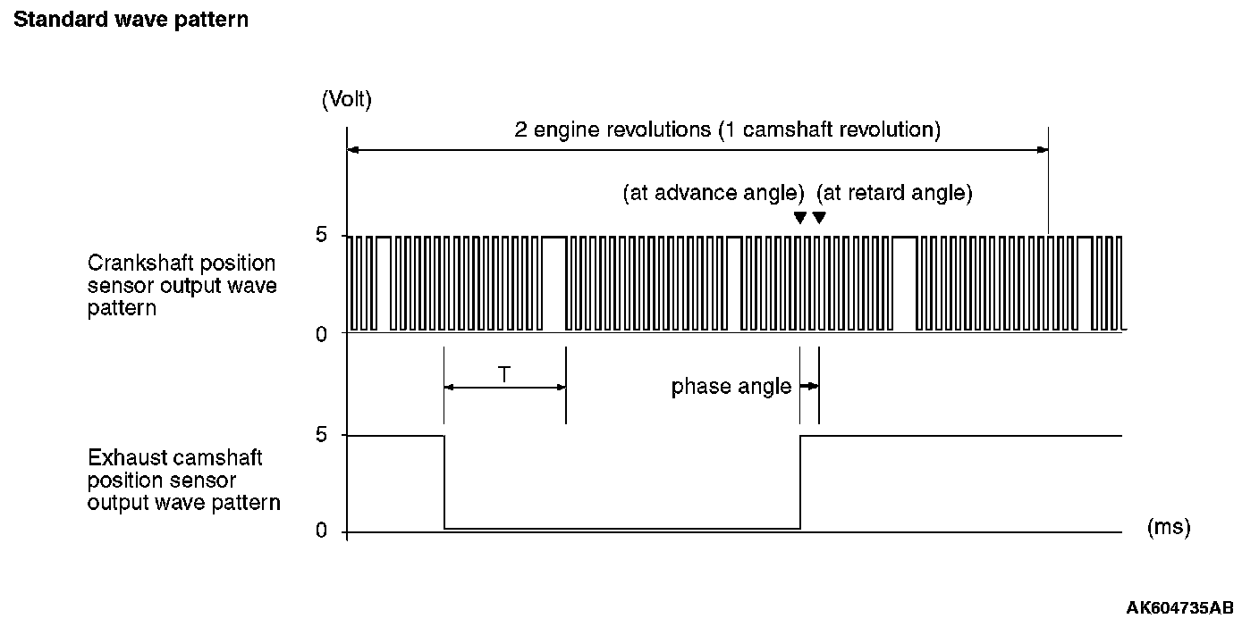 - Verify that, toward the engine speed of 2,500 r/min, time difference T from when the crankshaft position sensor output wave falls to when the exhaust camshaft position sensor output wave falls becomes less.