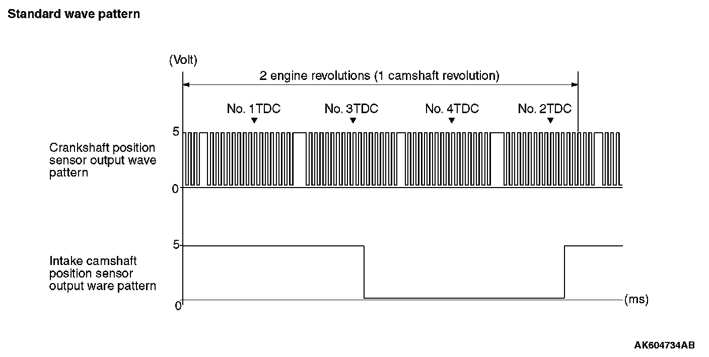 INSPECTION PROCEDURE USING AN OSCILLOSCOPEINTAKE CAMSHAFT POSITION SENSOR AND CRANKSHAFT POSITION SENSOR