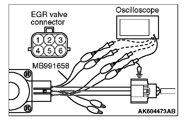 2. Connect the oscilloscope probe to the EGR valve connector terminal No. 1, terminal No. 3, terminal No. 4, terminal No. 6 respectively.