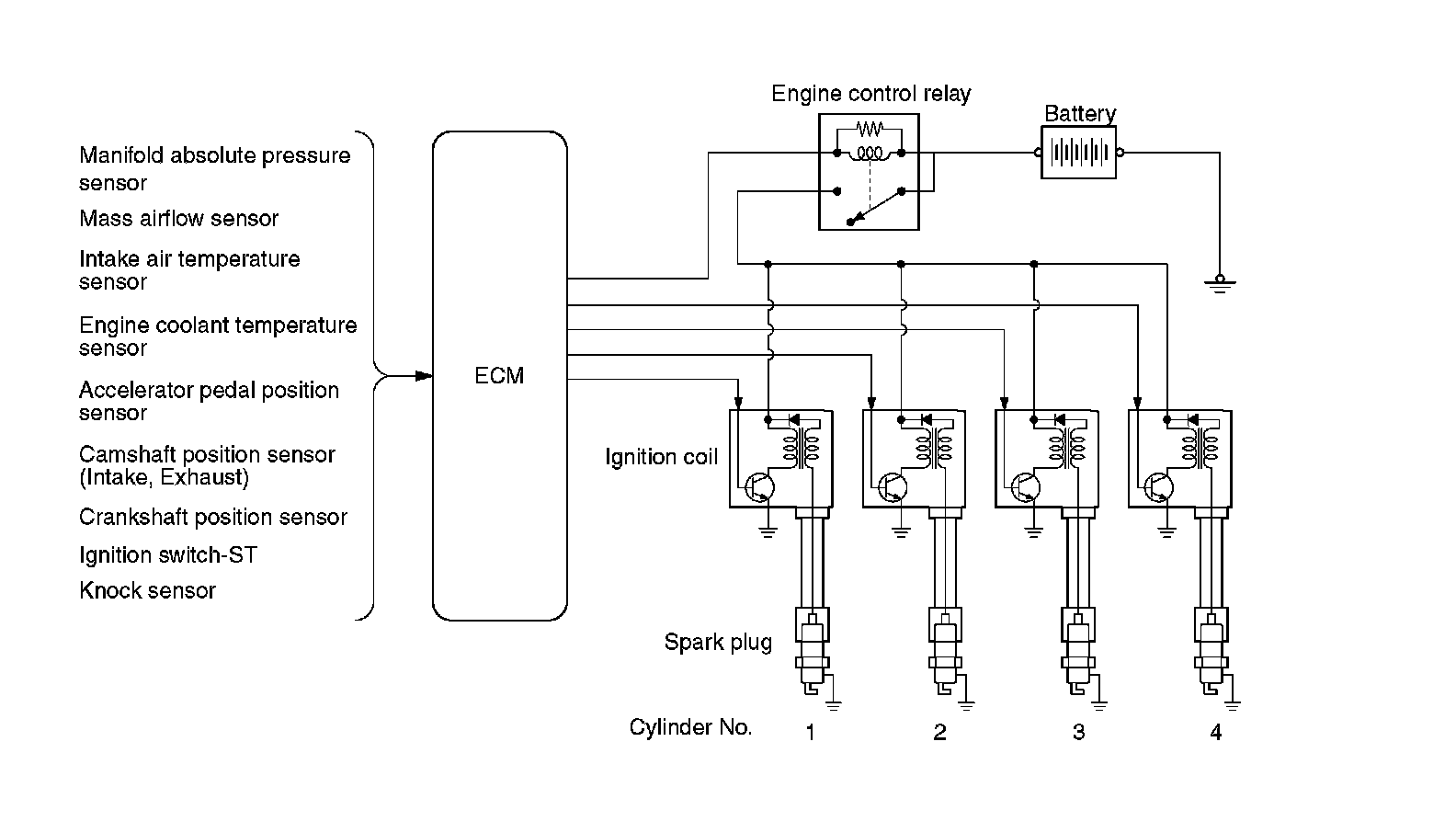 The ECM determines which ignition coil should be controlled by means of the signals from the camshaft position sensor and the crank angle sensor. It also detects the crankshaft position, in order to provide ignition at the most appropriate timing in response to the engine operation conditions.