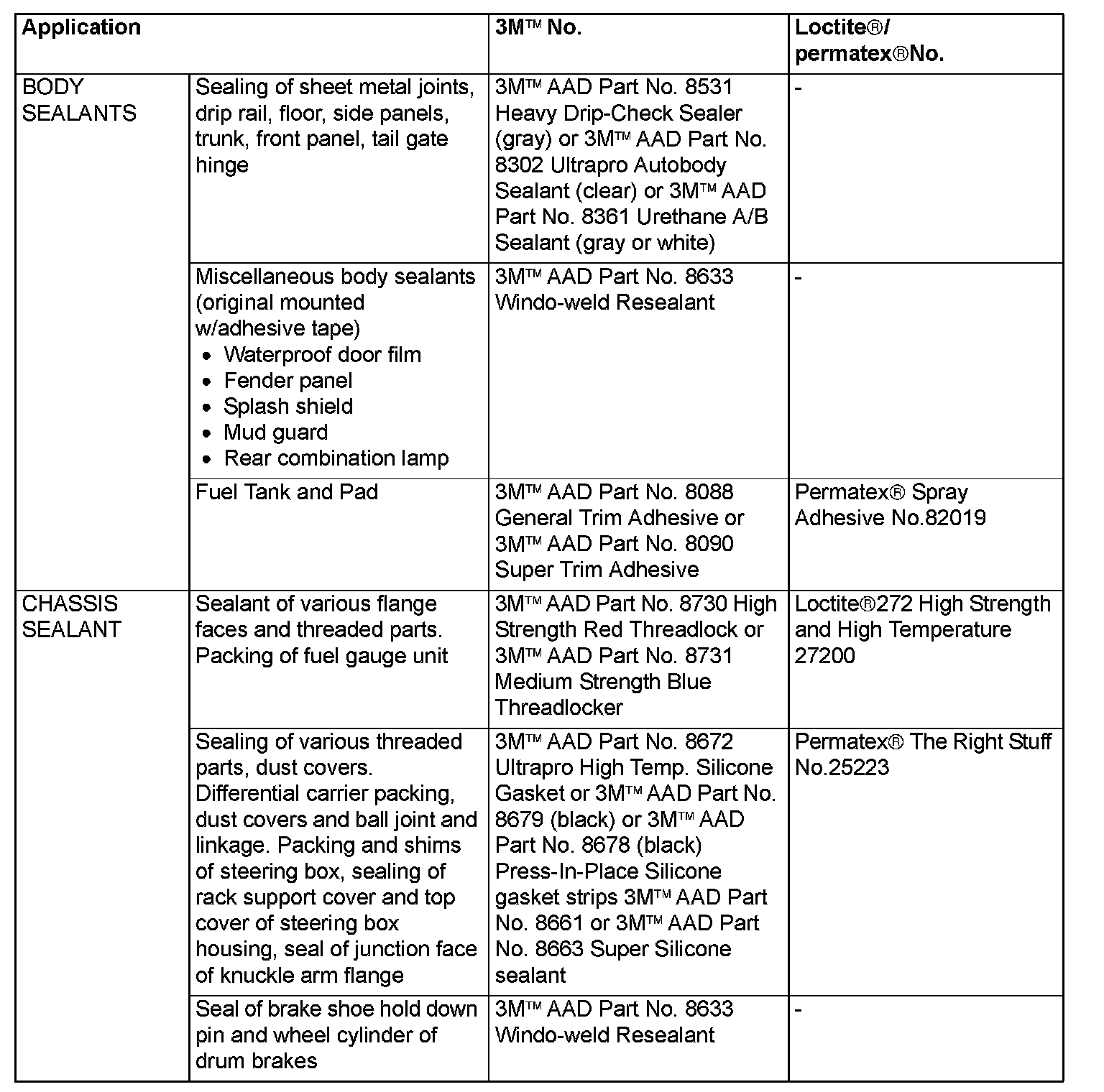 Main Sealant and Adhesive Table