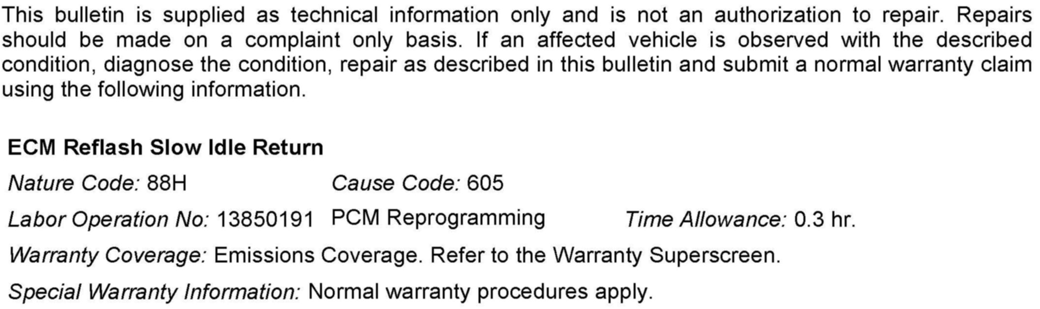 This TSB advises technicians to reprogram the ECM with new software to correct the parameters controlling engine speed and the rate at which it returns to idle when a vehicle is not in motion.