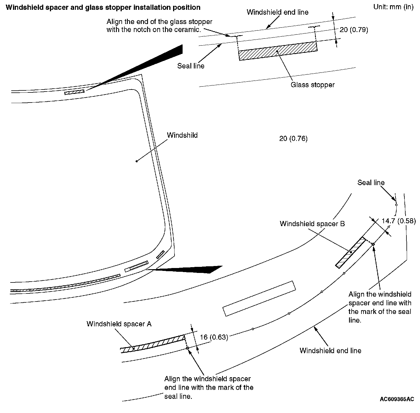 2. Install the windshield spacer and glass stoppers to the specified positions so that there are no adrift or warped surfaces inside the windshield.