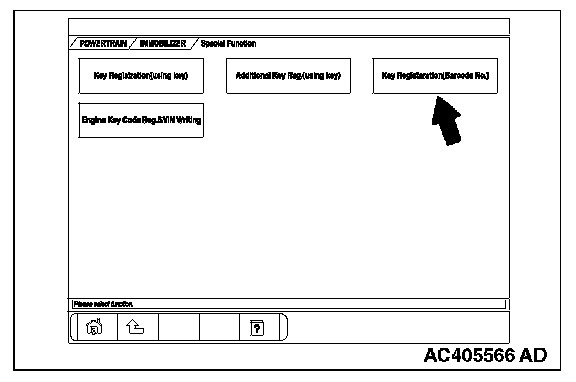 ENCRYPTED CODE REGISTRATION USING BARCODE NO.When the ignition key that starts the engine is replaced due to the replacement of the ignition key set, the ignition key cylinder, etc., the barcode No. must be used to register encrypted codes.