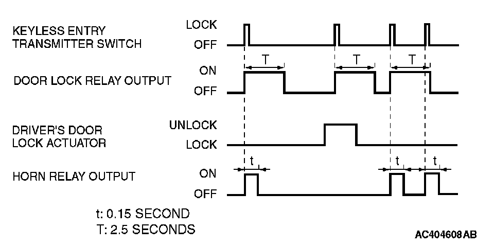 When the lock signal from the keyless entry transmitter is received into ETACS-ECU, all doors are locked and the horn sounds. If the driver's door cannot be locked even when the keyless entry transmitter is operated, the horn does not sound.