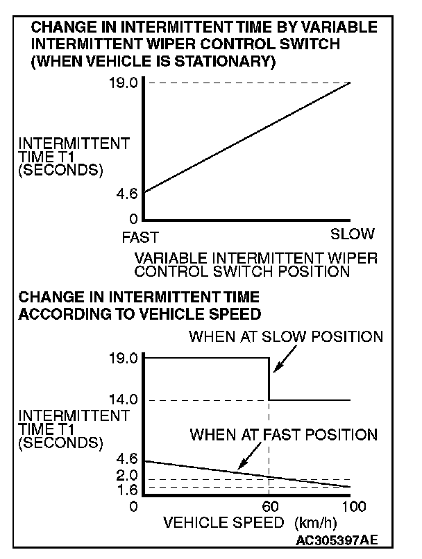 ETACS-ECU uses the dial position of the variable intermittent wiper control switch and the vehicle speed signal sent by the combination meter to calculate the interval to be sent to the front-ECU.