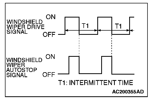 The front-ECU determines the intermittent time T1 from the input SWS data signal, and turns ON the windshield wiper drive signal. When the wiper is at the STOP position, the windshield wiper auto-stop signal goes OFF then turn OFF the windshield wiper drive signal. After the intermittent time T1 seconds from when the windshield wiper drive signal turned ON, the windshield wiper drive signal is turned ON again and the above operation is repeated.