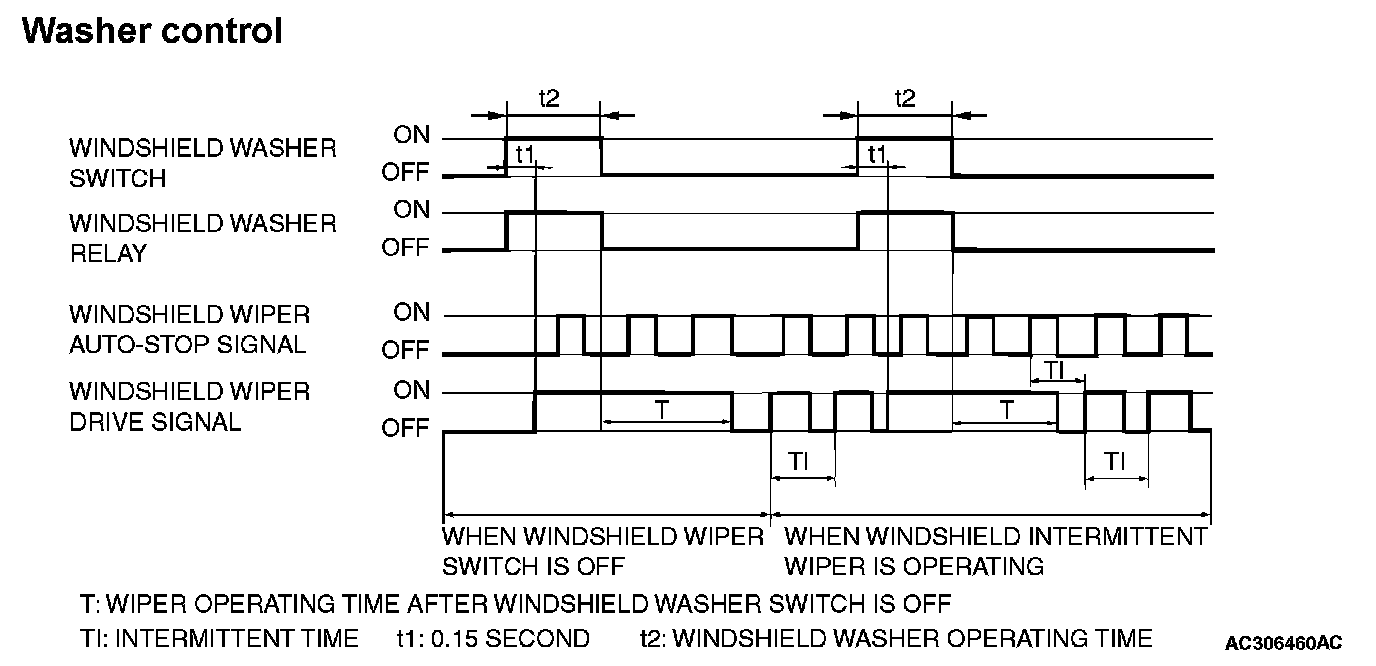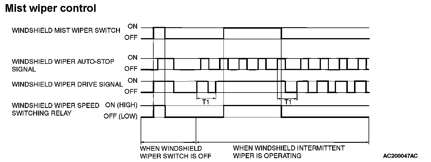 When the windshield mist switch is turned on briefly, the wiper operates once at low speed. At the point the windshield mist switch is turned ON, if the windshield wiper has been operating intermittently, the same operations as the above will be performed while the windshield mist wiper switch is ON. After the windshield mist wiper switch goes OFF, the intermittent operations will be set again T1 seconds after the last windshield wiper auto-stop signal turning ON.