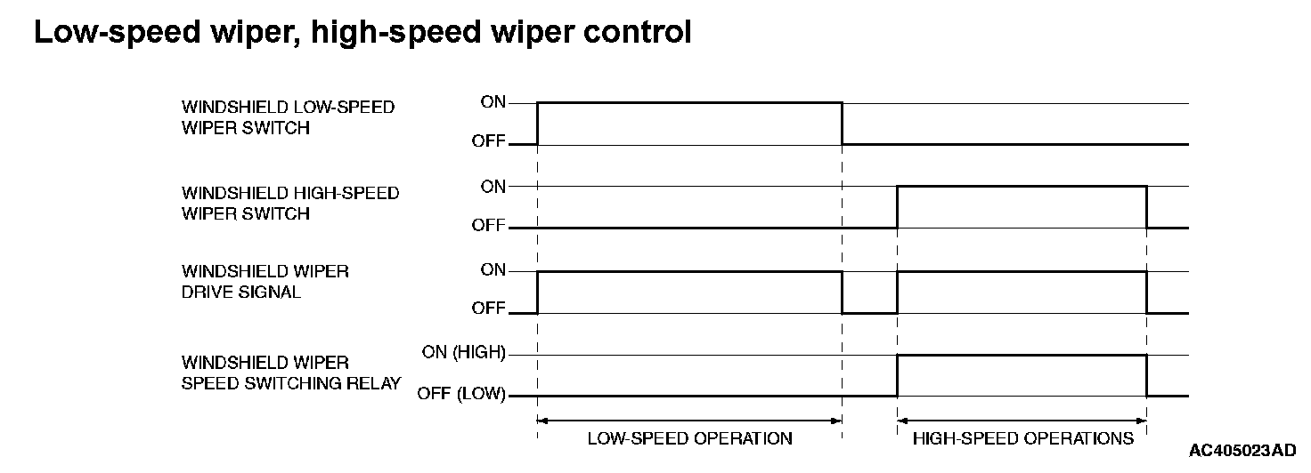 When the ignition switch in at the ACC or ON position, and the windshield low-speed wiper switch of the column switch is turned ON, the front-ECU turns ON the windshield wiper drive signal, turns OFF (LOW) the windshield wiper speed relay, and operates the windshield wiper at low-speed. Next, when the windshield high speed wiper switch is turned ON, the windshield wiper drive signal is turned ON, the windshield wiper speed switching relay is turned ON (HIGH), and the windshield wiper is operated at high-speed.