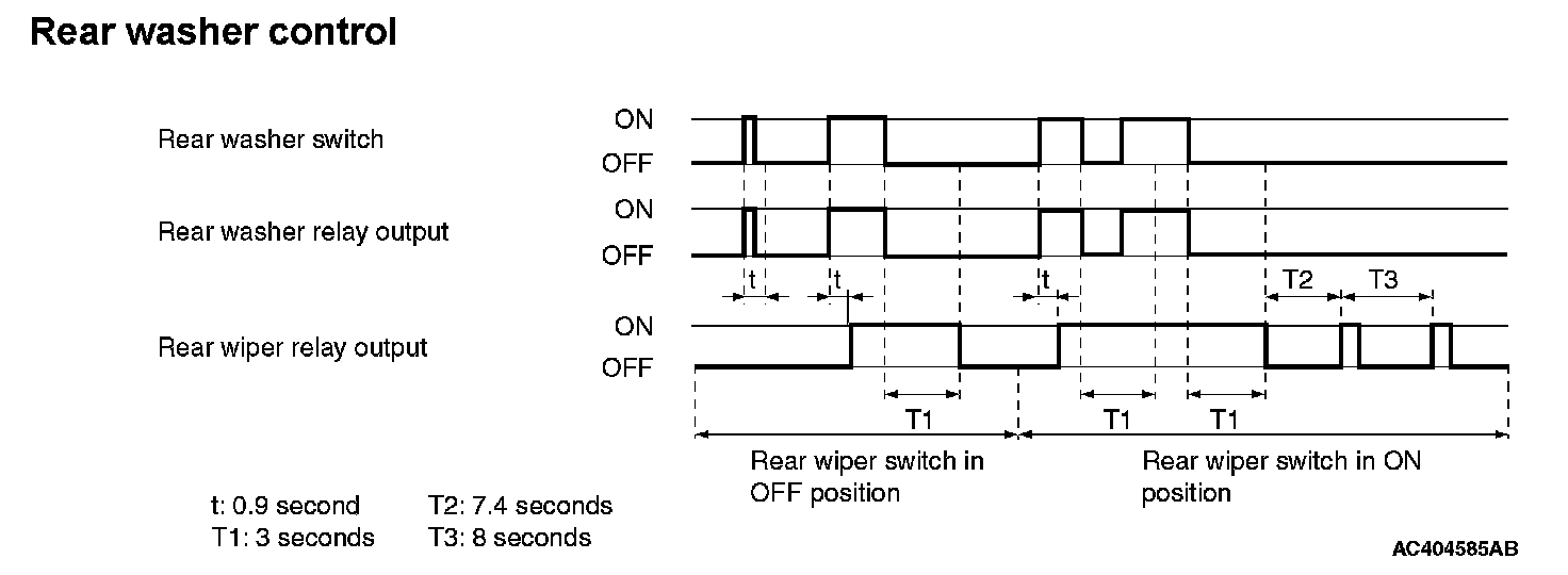 When the rear washer switch on the column switch is turned ON with the ignition switch ACC or ON, the ETACS-ECU turns ON the rear washer relay. If the rear washer switch remains ON for 0.9 second or more, the rear wiper operates. 3 seconds after the rear washer switch is turned OFF, the rear wiper is stopped.