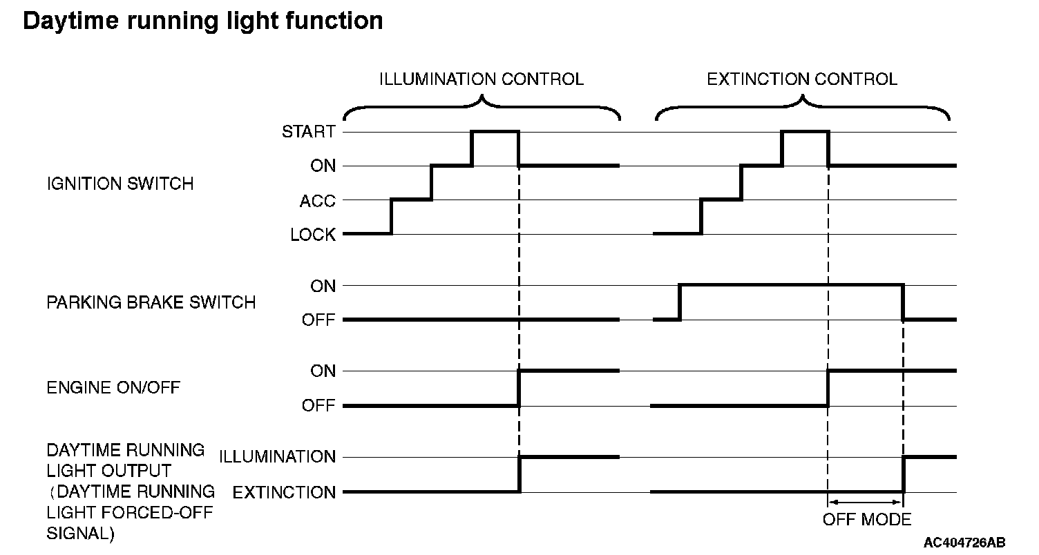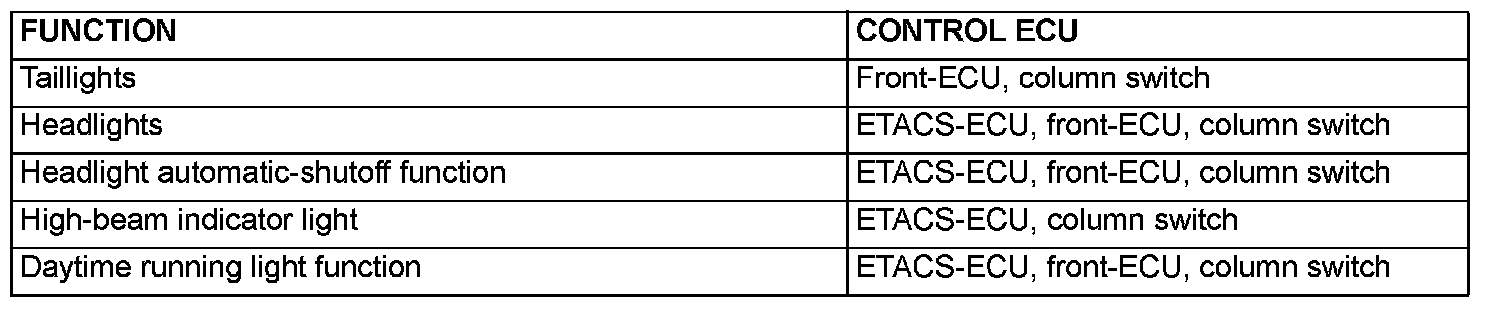The ETACS-ECU outputs the daytime running light forced-OFF signal to the front-ECU based on the input signal sent via CAN communication. The front-ECU controls illumination and extinction of the daytime running light according to the daytime running light forced-OFF signal.