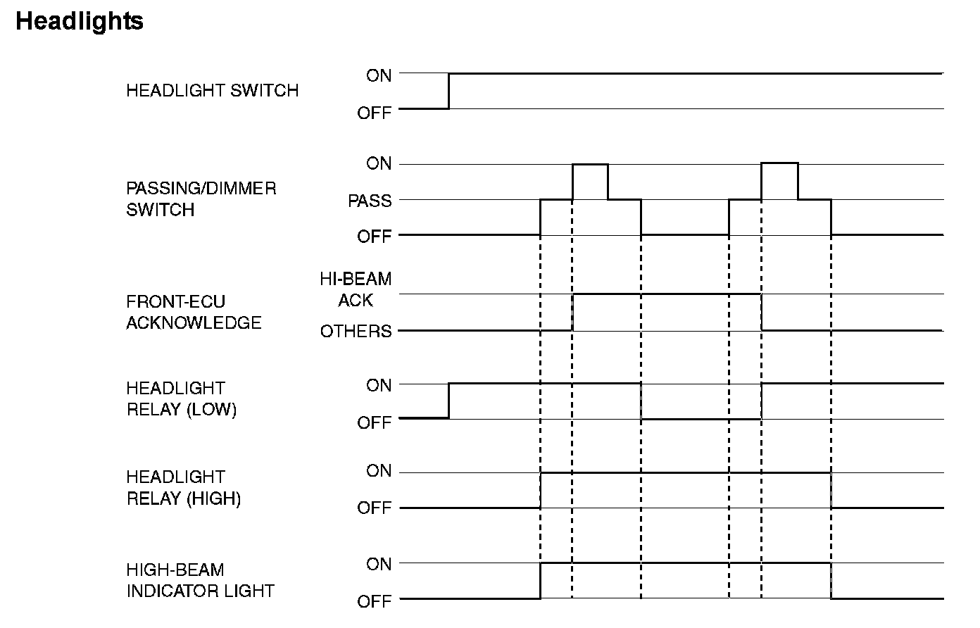 If the column switch sends a headlight switch "ON" signal to the front-ECU, the front-ECU turns on its headlight relay (LOW), causing the low-beam headlights to illuminate. If the dimmer switch is turned on while the headlight relay (LOW) is on, the front-ECU turns on the headlight relay (HIGH), causing the high-beam headlights to illuminate.