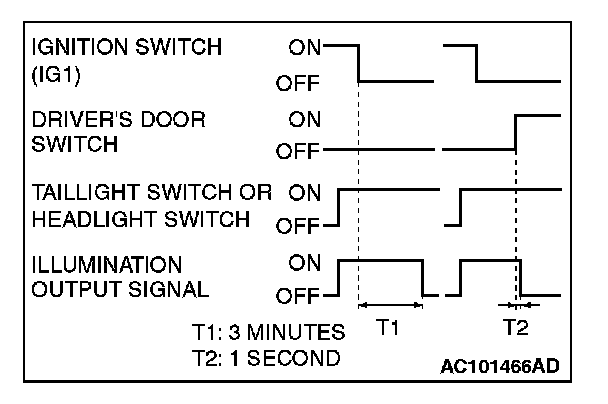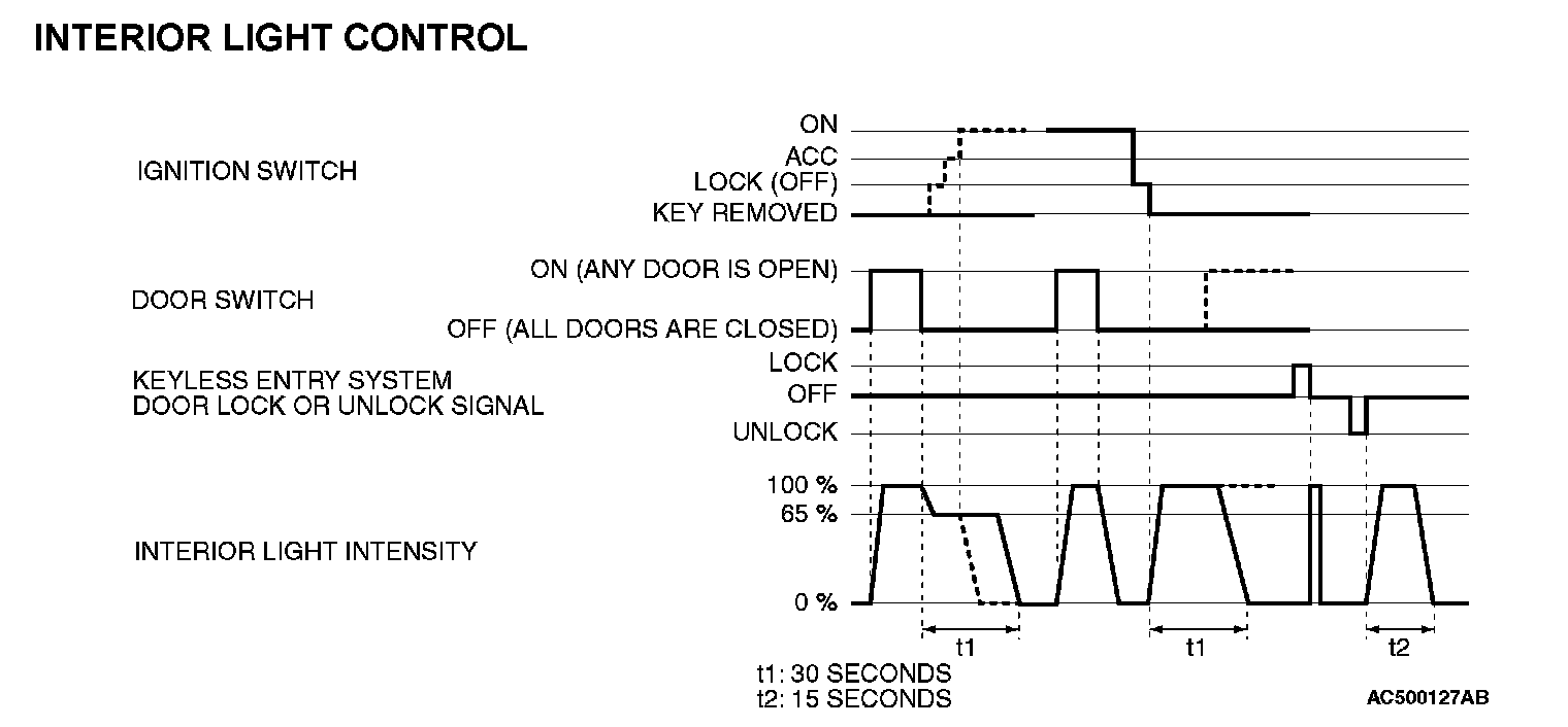 NOTE: The dotted lines indicate that lighting mode when the ignition switch is turned ON, door is locked, or any door is opened during the timer illumination time.