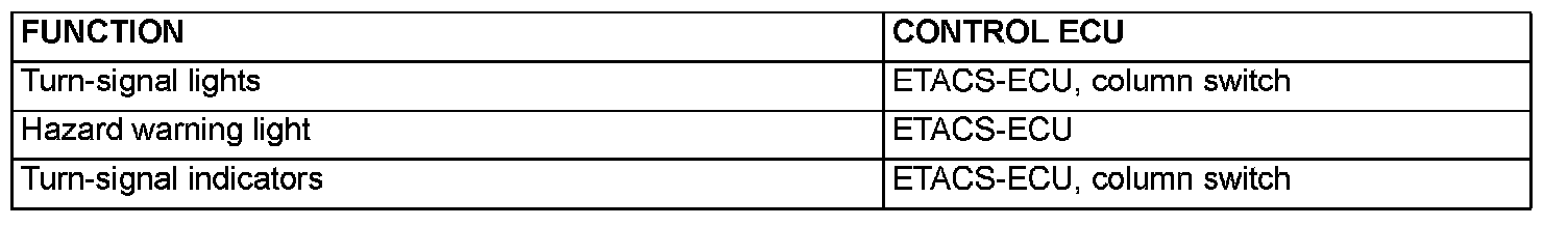 At the same time that the turn-signal lights are illuminated, the ETACS-ECU sends a signal to illuminate the turn-signal light indicator via the CAN bus line. The combination meter receives the transmitted signal and turns the turn-signal light indicator on and off.