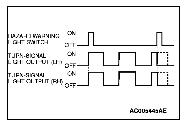 The turn-signal light output (flashing signal) is turned ON when the ignition switch is ON and the turn-signal light switch is ON (LH or RH). If the front or rear turn-signal light bulb has burned out, the flashing speed increases to indicate that the bulb has burned out.