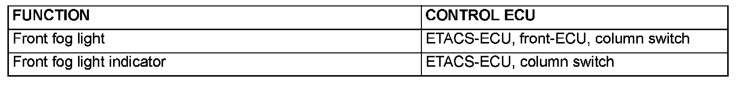 At the same time that the front fog lights are illuminated, the ETACS-ECU sends a signal to illuminate the front fog light indicator via the CAN bus line. The combination meter receives the transmitted signal and turns the front fog light indicator on and off.
