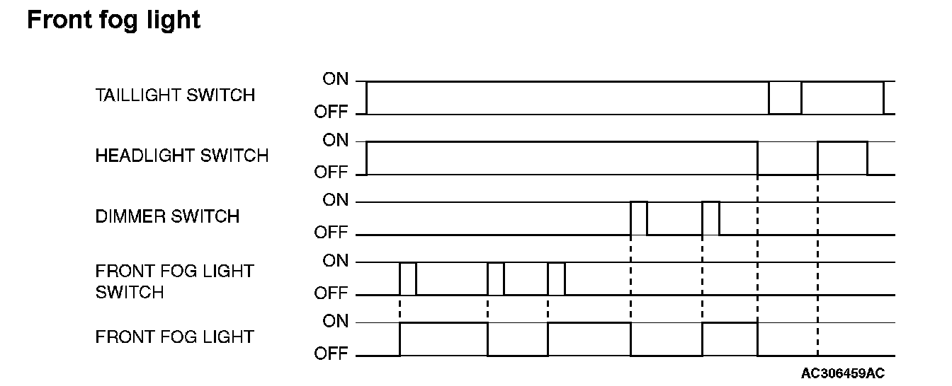 The front fog lights will be switched off when any of the following conditions are met. The front fog lights will also be switched off automatically by headlight automatic shutoff function.