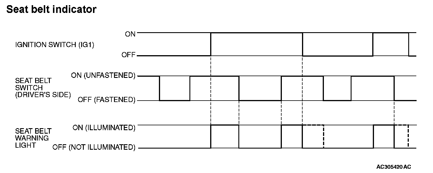 If any of the following conditions are met with the ignition switch at "ON" or "ST", the ETACS-ECU illuminates or extinguishes the seat belt indicator by using the driver's seat belt switch signal and the vehicle speed signal from the combination meter.