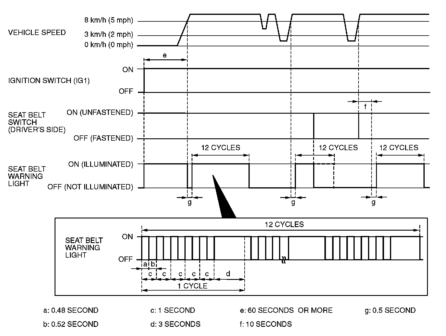 a. The vehicle speed has reached 8 km/h (5 mph) while the seat belt switch is turned on (driver's seat belt is not fastened) with the ignition switch "ON.