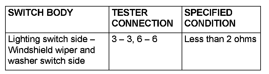 Remove the turn-signal light and lighting switch and windshield wiper and washer switch. Then check continuity between the switch body terminals.