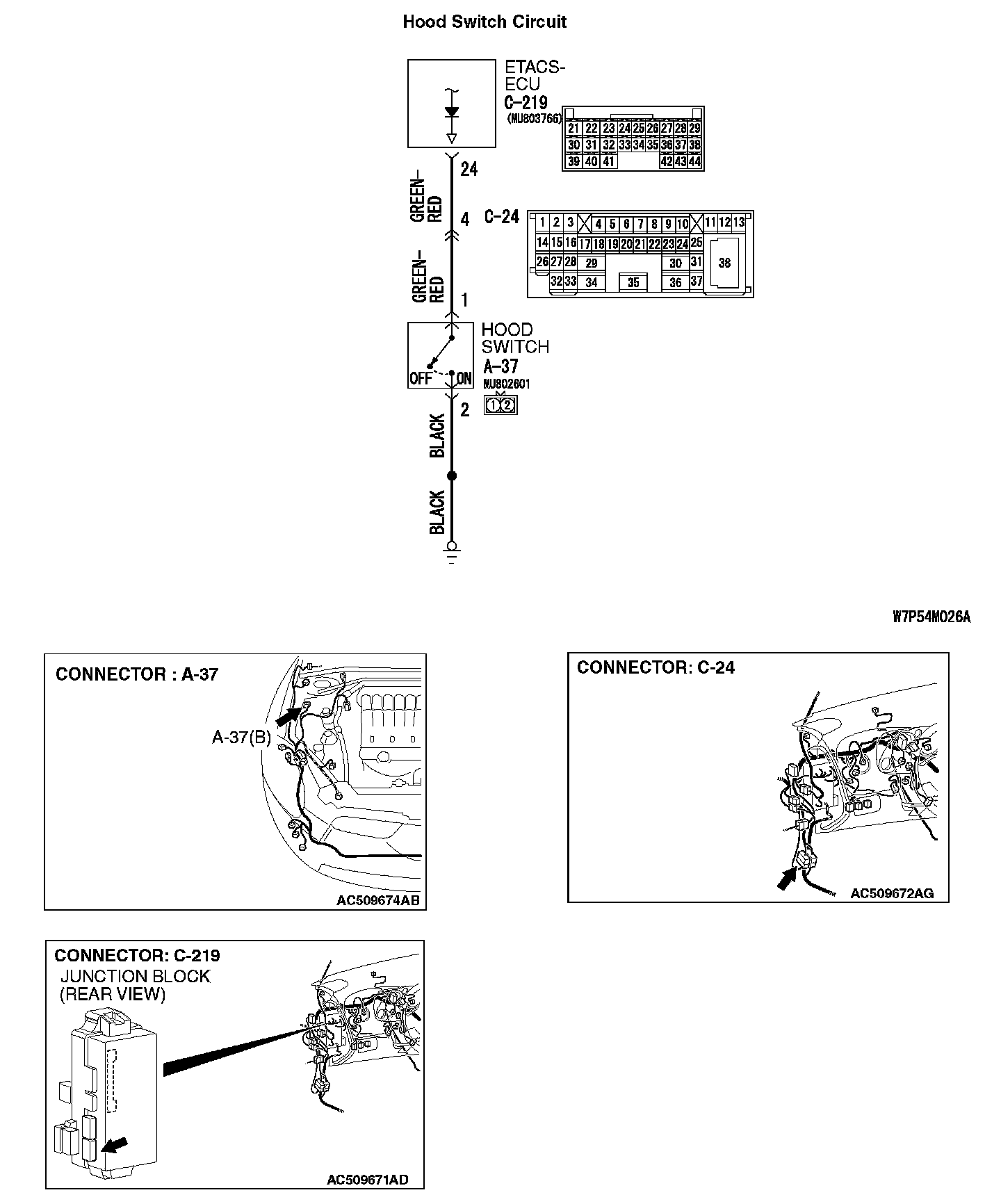 Q: Is the wiring harness between hood switch connector A-37 (terminal 1) and ETACS-ECU connector C-219 (terminal 24) in good condition?