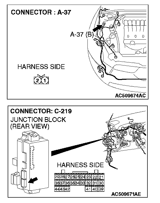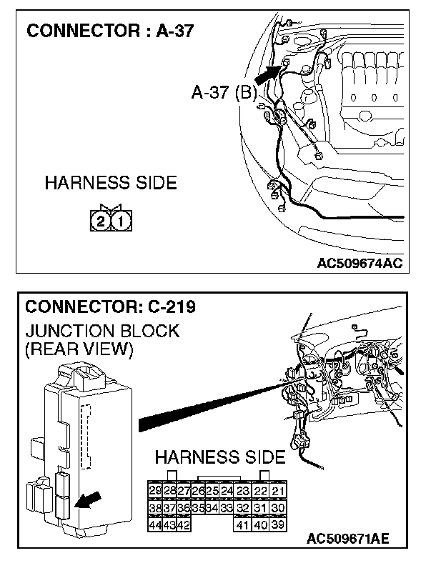 STEP 5. Check hood switch connector A-37 and ETACS-ECU connector C-219 for loose, corroded or damaged terminals, or terminals pushed back in the connector.