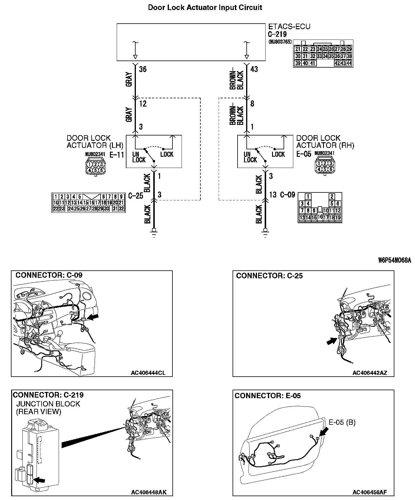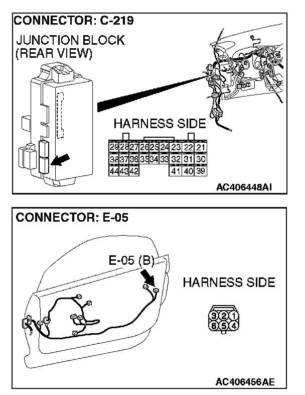 STEP 13. Check the wiring harness between door lock actuator (RH) connector E-05 (terminal 1) and ETACS-ECU connector C-219 (terminal 43).