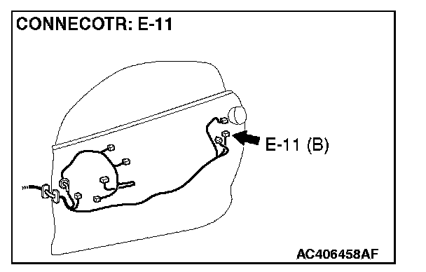 Disconnect door lock actuator (LH) connector E-11. Then check continuity between the terminals. Refer to Door Handle and Latch.