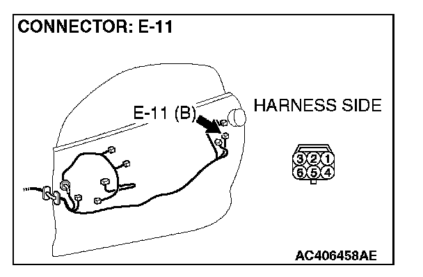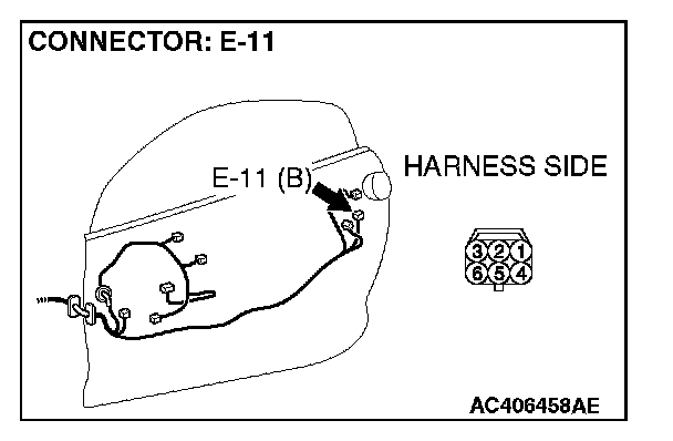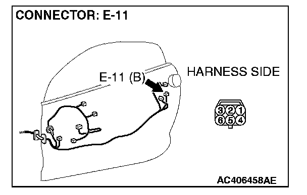 1. Disconnect door lock actuator (LH) connector E-11 and measure the resistance available at the wiring harness side of the connector.