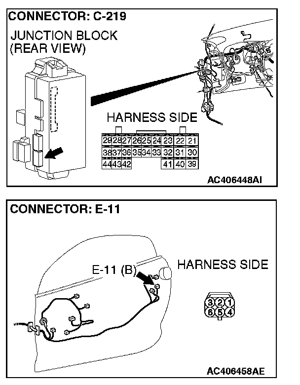 STEP 7. Check the wiring harness between door lock actuator (LH) connector E-11 (terminal 3) and ETACS-ECU connector C-219 (terminal 36).