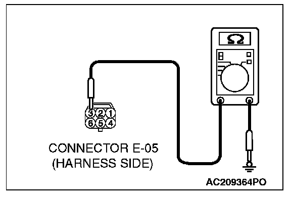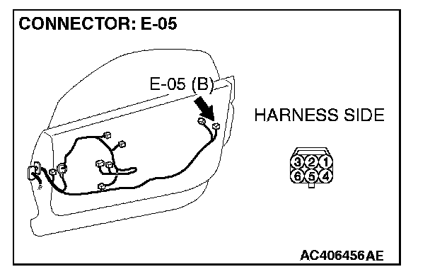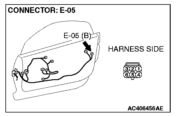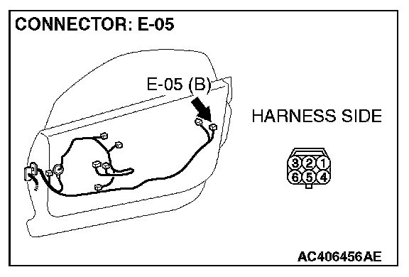 1. Disconnect door lock actuator (RH) connector E-05 and measure the resistance available at the wiring harness side of the connector.