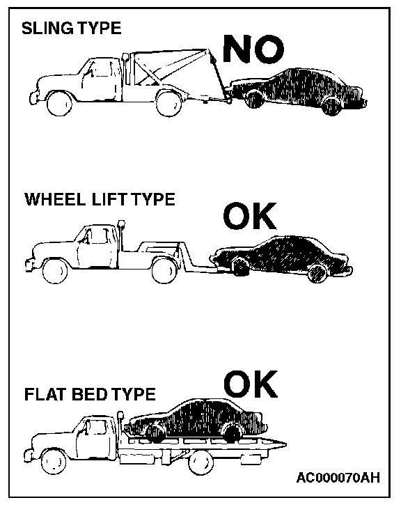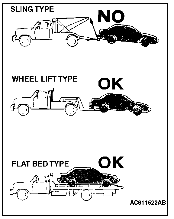 This vehicle cannot be towed by a wrecker using sling-type equipment; otherwise the bumper may become deformed. If this vehicle is towed, use wheel lift or flat bed equipment.