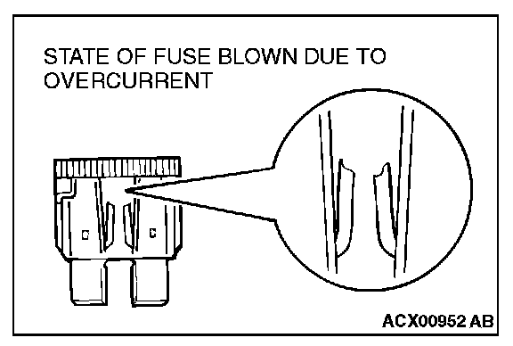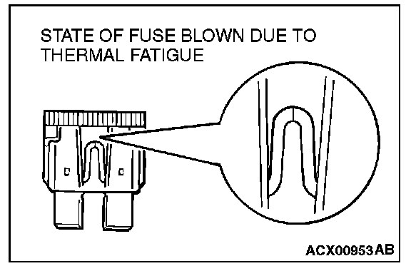 CAUTIONS IN EVENT OF BLOWN FUSEWhen a fuse is blown, there are two probable causes. One is that it is blown due to flow of current exceeding its rating. The other is that it is blown due to repeated on/off current flowing through it. Which of the two causes is responsible can be easily determined by visual check as described below.