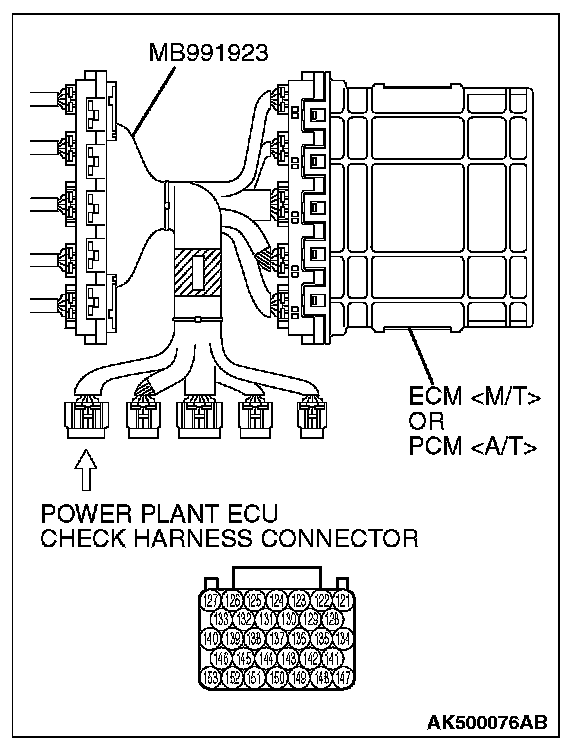 1. Disconnect all ECM [M/T] connectors or PCM [A/T] connectors. Connect the check harness special tool (MB991923) between the separated connectors.