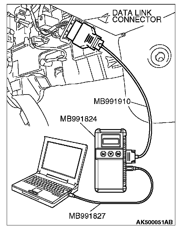 CAUTION: To prevent damage to scan tool MB991958, always turn the ignition switch to the "LOCK" (OFF) position before connecting or disconnecting scan tool MB991958.
