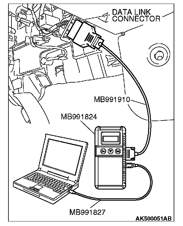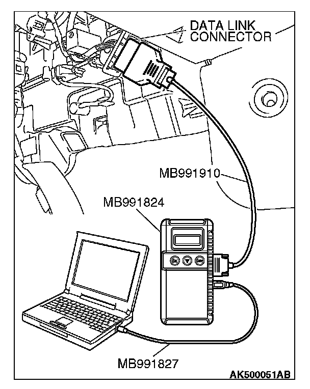 CAUTION: To prevent damage to scan tool MB991958, always turn the ignition switch to the "LOCK" (OFF) position before connecting or disconnecting scan tool MB991958.