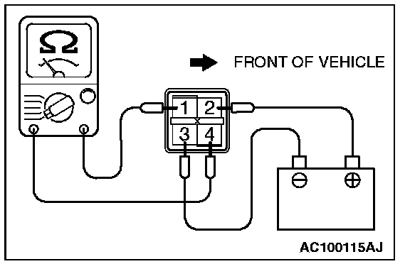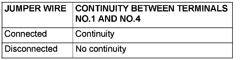 3. Check for continuity between A/T control relay terminals 1 and 4 when the jumper wires are connected to and disconnected from the battery.