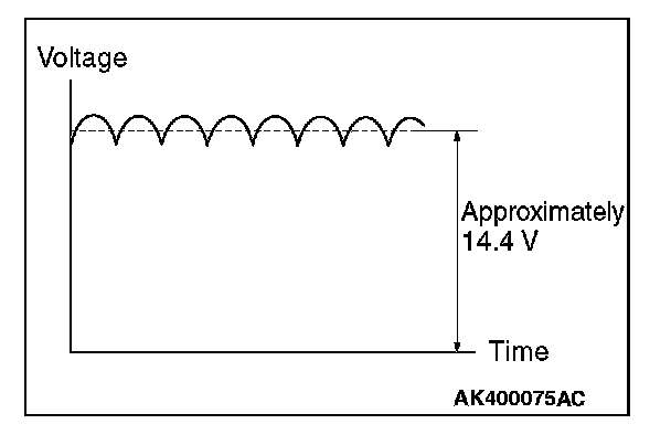 The generator output voltage rises as the field current increases and it falls as the field current decreases. When the battery positive voltage (generator S terminal voltage) reaches a regulated voltage of approximately 14.4 V, the field current is cut off.