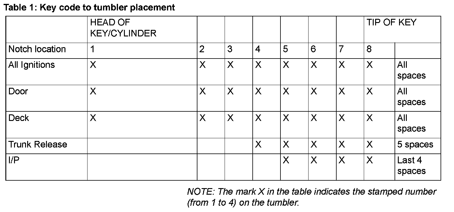 1. From the key code select the proper tumbler combinations required to make afunctional lock, reference key biting and tumbler placement chart (refer to table 1).