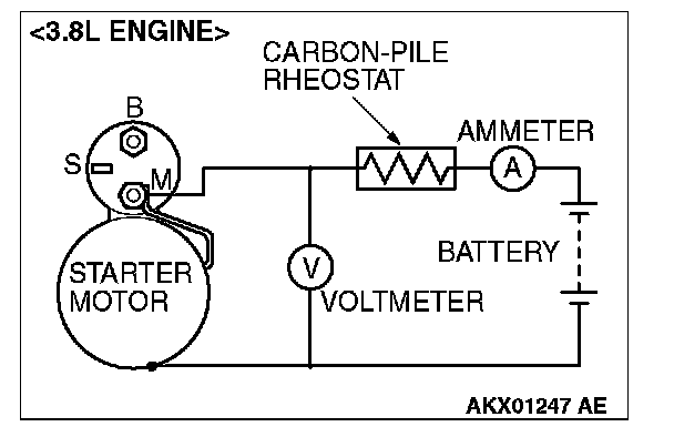 2. Connect a test ammeter (100-ampere scale) and carbon pile rheostat in series between the positive battery terminal and starter motor terminal.