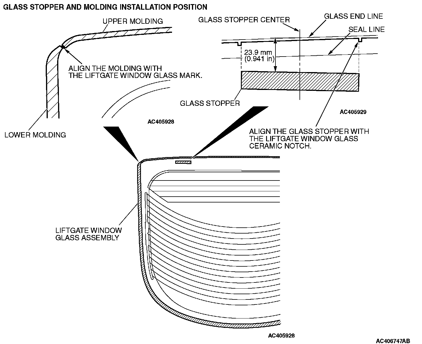 2. Assemble the glass stopper, lower molding and upper molding to specified positions on the liftgate window glass.