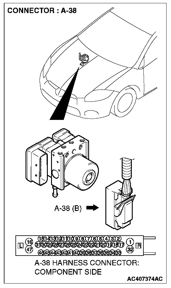 2. Disconnect the TCL/ASC-ECU connector A-38, and then use special tool MB991997 to measure the output voltage at the harness side connector.