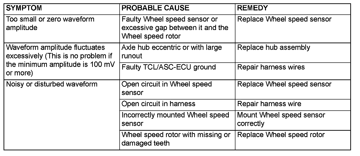 NOTE: The Wheel speed sensor cable moves in relation to motion of the front or rear suspension. Therefore, it is likely that it has an open circuit only when driving on rough roads but it functions normally when driving on smooth roads. It is recommended to observe sensor output voltage waveform also under special conditions, such as driving on a rough road.