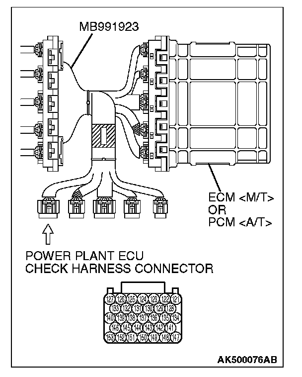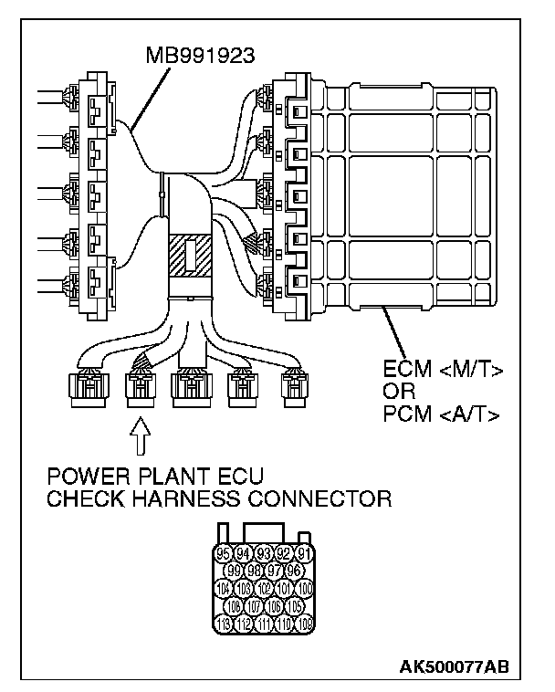 1. Disconnect all ECM [M/T] connectors or PCM [A/T] connectors. Connect the check harness special tool (MB991923) between the separated connectors.