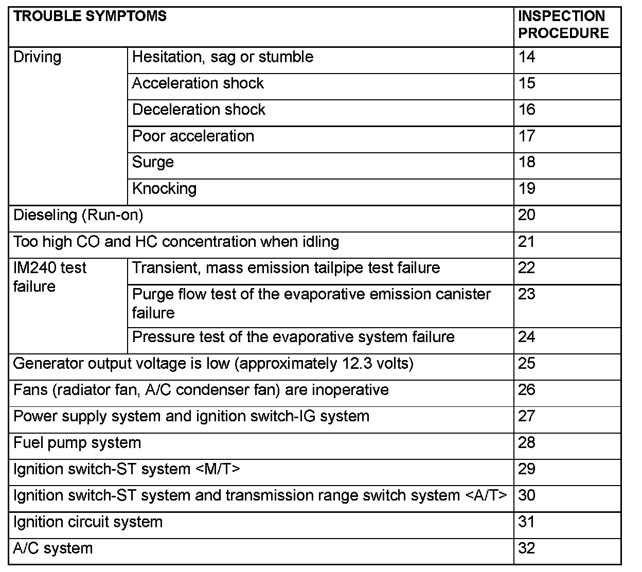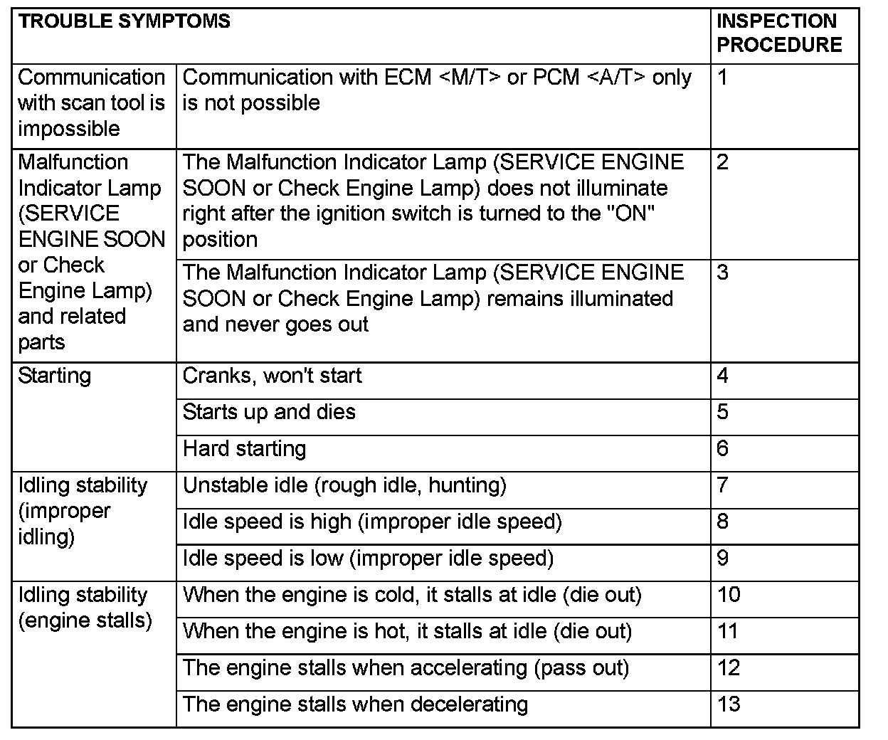 SYMPTOM CHARTWARNING: When touching the throttle valve, surely shut off the driving circuits of the throttle valve. In the event that the throttle valve is operated, a finger might be injured as the result of being caught by the throttle valve.