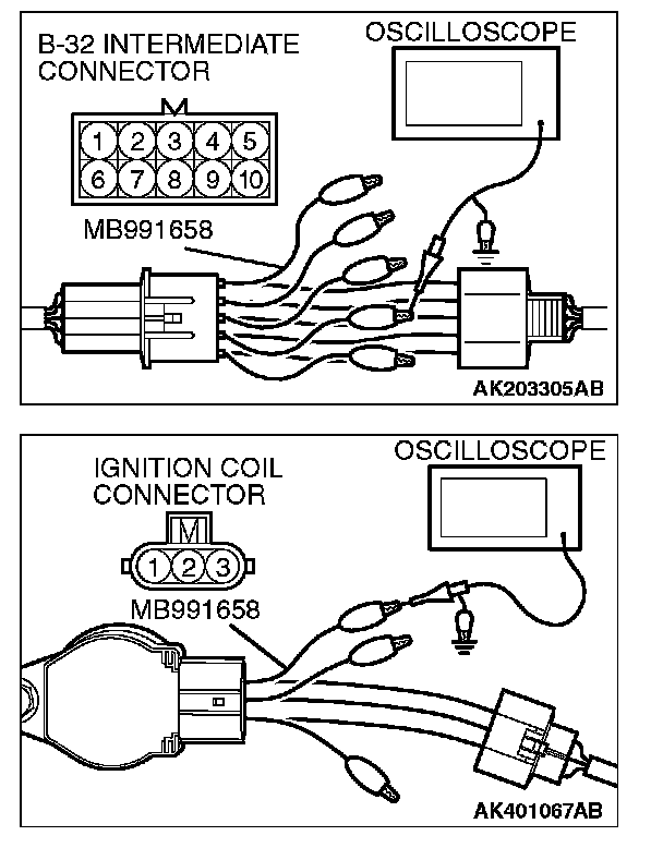 1. Disconnect the ignition coil connector, and connect test harness special tool (MB991658) between the separated connector. (All terminals should be connected.)