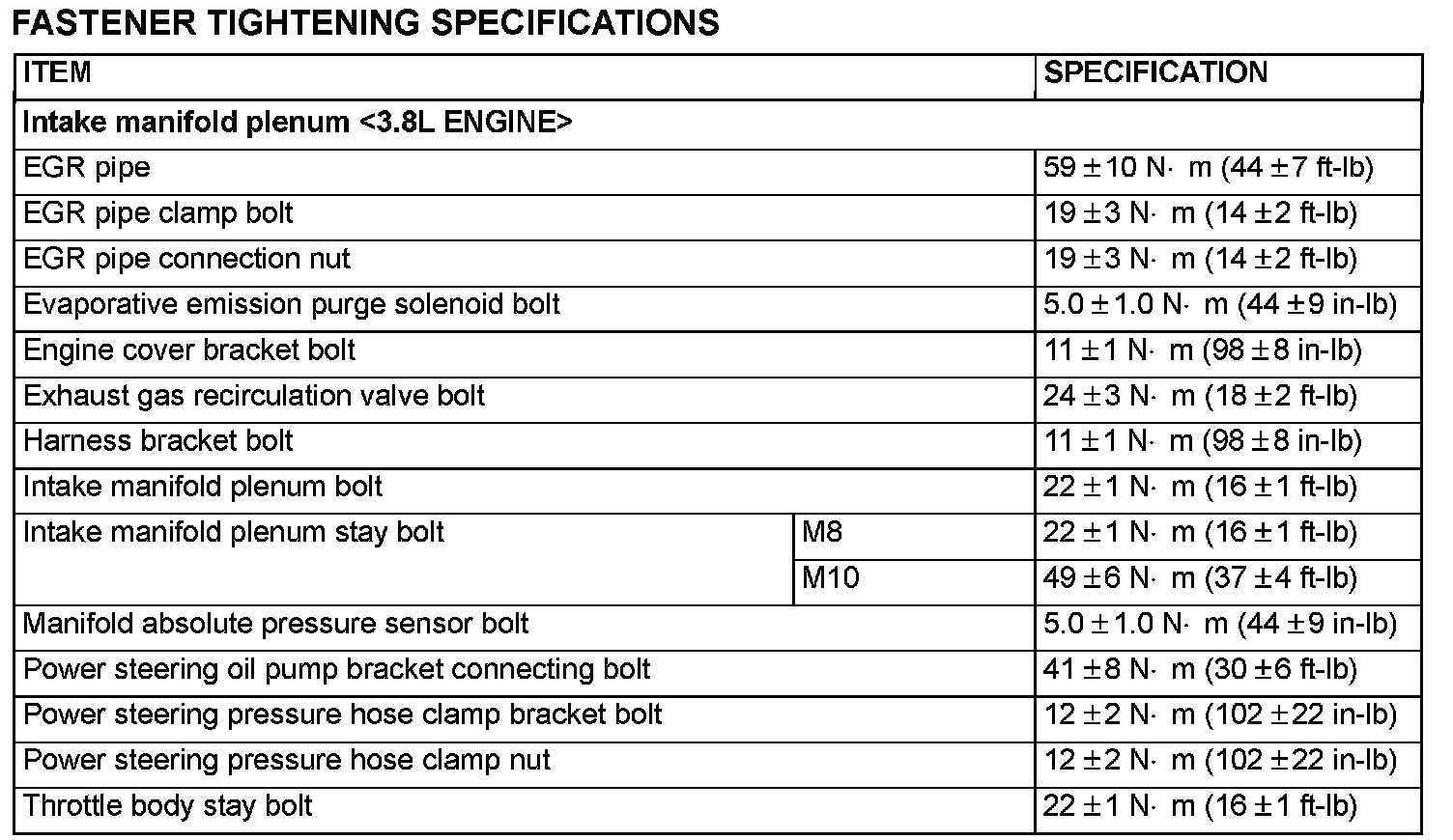Fastener Tightening Specifications: