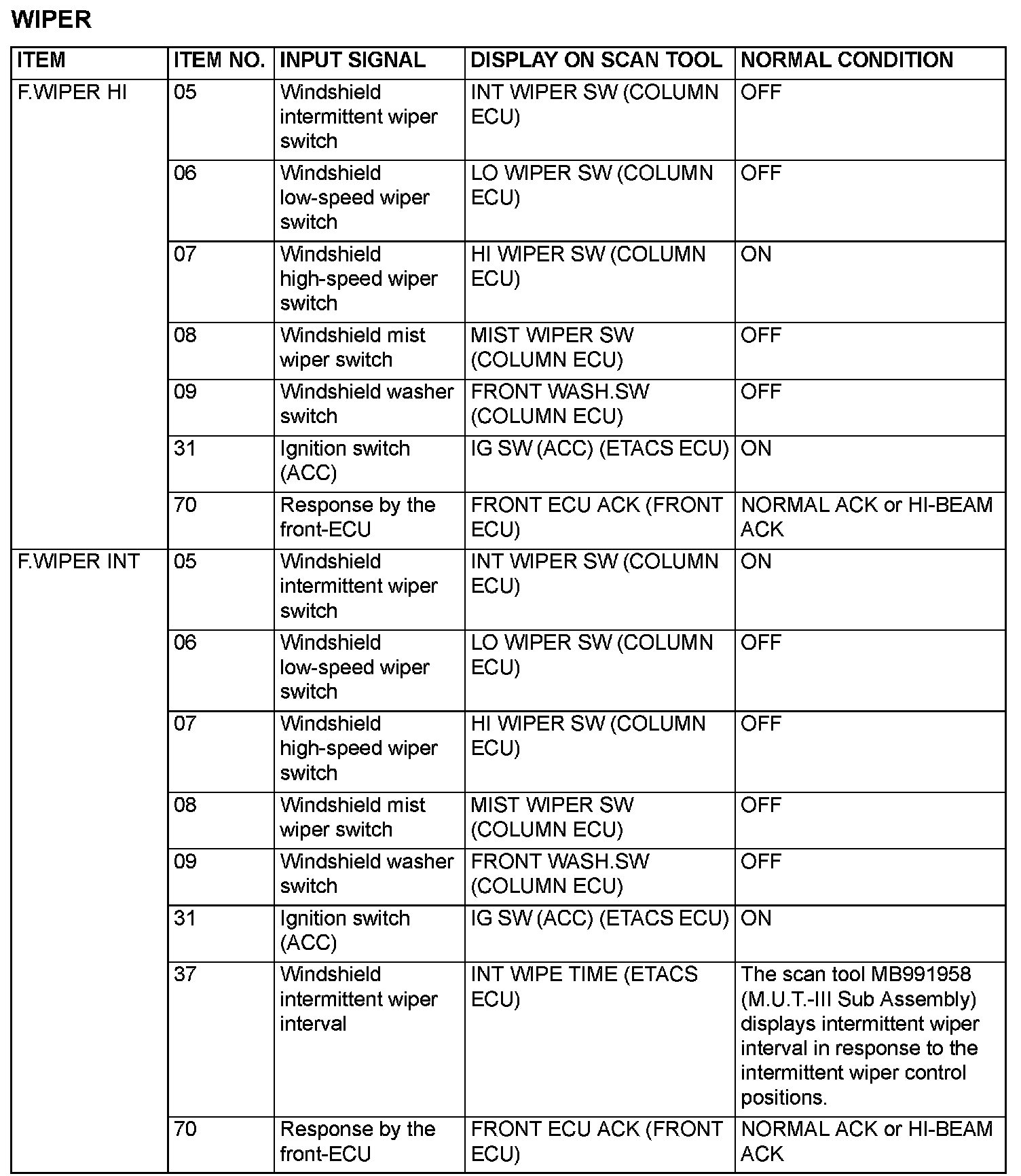 For checking item "HEADLIGHT HI", the scan tool MB991958 (M.U.T.-III Sub Assembly) displays "OFF" on the item No.2 "DIMMER SW" when the headlights are at high-beam. Therefore, the scan tool MB991958 (M.U.T.-III Sub Assembly) should display "ON" momentarily when the dimmer switch is operated.